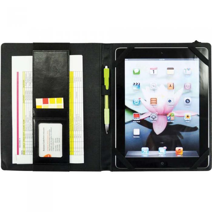 Stay Tuned E-Junior Padfolio Exterior metal plate Zippered main closure Removable elastic corners to secure iPad®, Samsung Galaxy or smaller tablets Includes 5"w x 8"h writing pad Materials: PVC (Polyvinyl chloride) Plastic