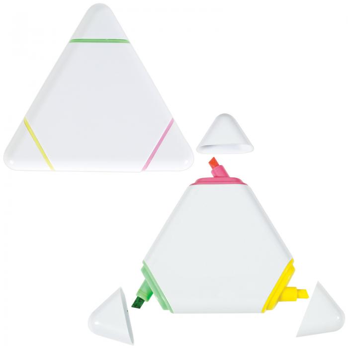 Promotional Trio Highlighter, a highlighter pen featuring three colours in one triangular shaped marker. Bright yellow, pink and green tips to help with studying, keeping notes organised, marking important sections of documents and much more. An excellent low cost promotional item thats priced to suit a budget. Ink shelf life is 3 months.