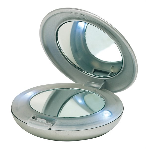 Lighted Mirror Compact w/Close-Up Mirror and Lighted Regular Mirror. Batteries included Illuminates when open.