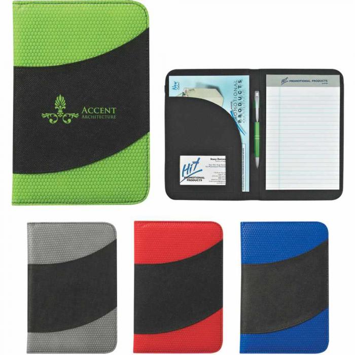 Sign Wave Junior Pad Holder Stylish sign wave design with (50) page 8 1/2" x 11" writing pad included Features stitched construction, mesh ID holder, transparent ID holder and elastic pen loop with interior flap pocket for papers Pen not included Made